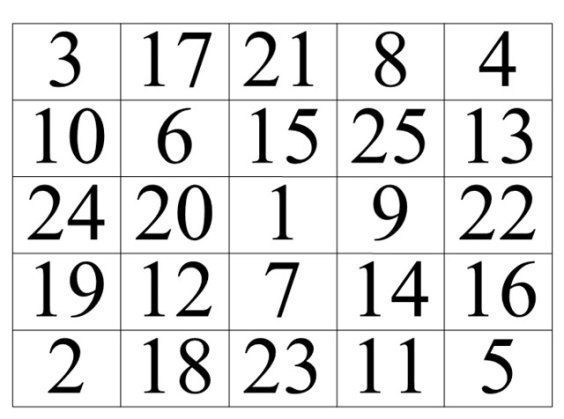 Правила тренировки на таблицах Шульте.Находить цифры необходимо беззвучным счётом, то есть про себя, в возрастающем порядке от 1 до 25 (без пропуска).