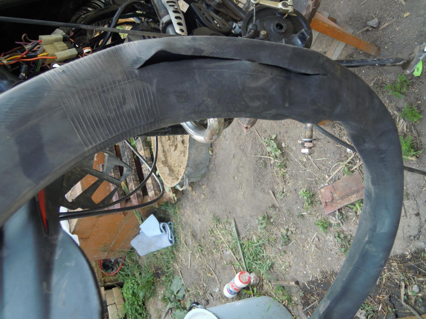 В общем когда остановился увидел причину такой расколбаски. Переднее колесо просто разбортовалось. Как позже выяснилось Корейская камера лопнула просто по шву (разошлась) и образовалась дырища около 40 см в длинну. На камере была надпись маде ин Корея. Сука! Как тряпка, мягкая и махры как будто наждачкой терли три года практически по всей окружности. Пробег той камеры как и всего мопедки составил всего 723 км от роду.