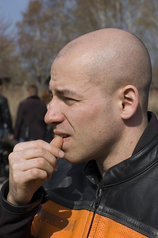 фотомодель типа "Пирожок" с соплей в носу для крутизны байкерского антуража. Ботинок новый, корреспондент успел снять почти новую подошву.