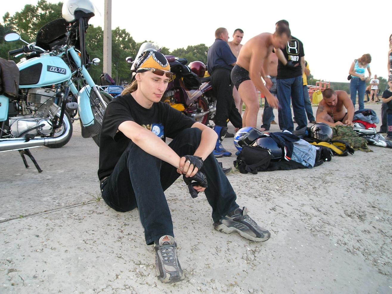 фотомодель типа "Пирожок" с соплей в носу для крутизны байкерского антуража. Ботинок новый, корреспондент успел снять почти новую подошву.
